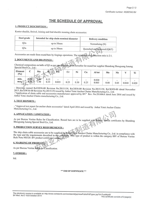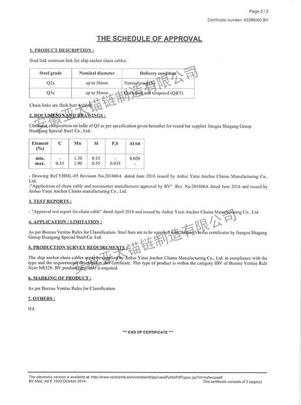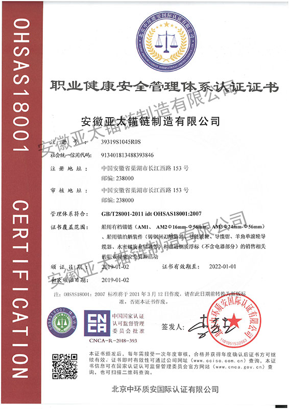 安徽亞太錨鏈制造有限公司是國家高新技術企業(yè),也是國家GB/T 549-2017《電焊錨鏈》標準的起草和制定單位之一。公司旗下設有錨鏈分廠、浮標分廠、舾裝件分廠等多個分廠。公司專業(yè)從事φ12.5mm-φ107mm二、三級船用錨鏈、浮標錨鏈、錨鏈附件,錨、船舶曬裝產(chǎn)品、航標、系船浮、船型標、多種規(guī)格海洋監(jiān)測浮標及航標燈等產(chǎn)品的生產(chǎn)、安裝和服務。目前公司的產(chǎn)品銷往全國各地船廠、碼頭、航標處、航道局、海洋局,并已走上國際市場,如東南亞、中東、歐美等國家。